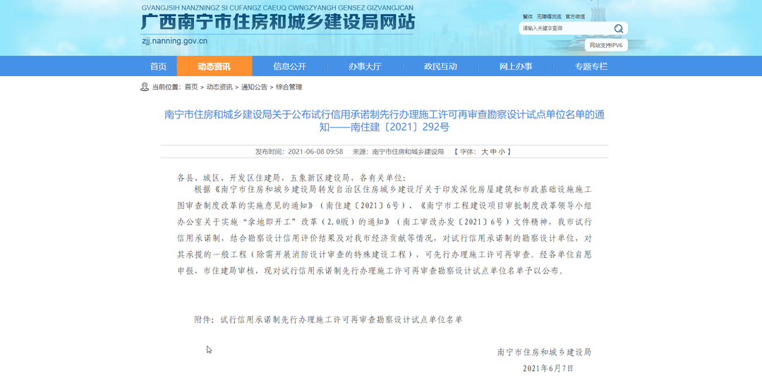 6月8日,南寧市住房和城鄉(xiāng)建設局發(fā)布《關于公布試行信用承諾制先行辦理施工許可再審查勘察設計試點單位名單的通知》(南住建〔2021〕292號)。