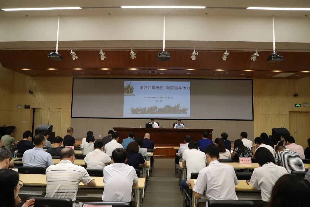 為幫助公司黨員干部更好地理解和開(kāi)展黨史學(xué)習(xí)教育,6月24日,公司黨委邀請(qǐng)了南寧市委市直機(jī)關(guān)工委副書記藍(lán)迅為公司黨員干部上了一堂生動(dòng)的黨史學(xué)習(xí)教育專題黨課,公司黨委書記韋文學(xué)主持會(huì)議,公司全體黨員和中層以上領(lǐng)導(dǎo)干部近160余人現(xiàn)場(chǎng)聆聽(tīng)了專題黨課。